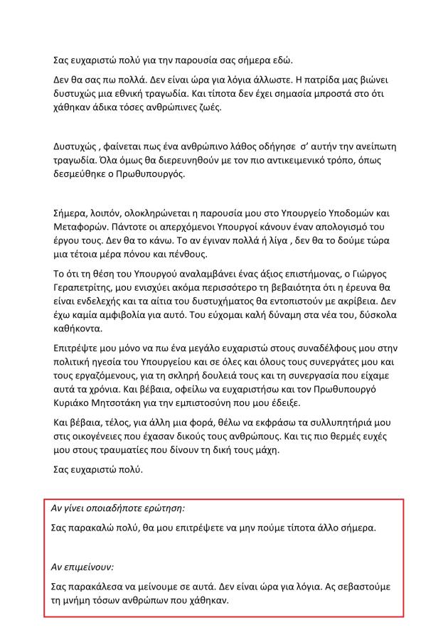 Πιο συγκεκριμένα ,από το γραφείο Τύπου του Κώστα Καραμανλή μοιράστηκε ένα έγγραφο προς τους δημοσιογράφους , σχετικά με την παράδοση -παραλαβή του υπουργείου Υποδομών.