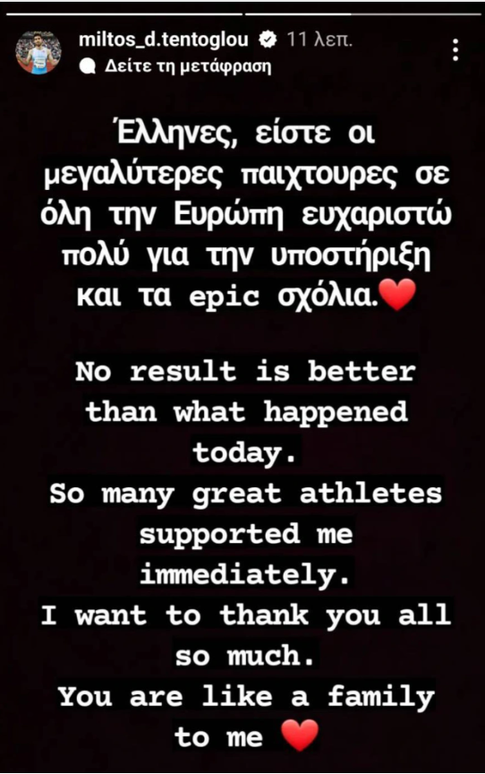 Αμέσως μετά την επιτυχία του στη Γαλλία, ο Τεντόγλου ανέβασε ένα στόρι στο Instagram, όπου ευχαρίστησε τους Έλληνες, γράφοντας: “Έλληνες είστε οι μεγαλύτερες παιχτούρες σε όλη την Ευρώπη. Ευχαριστώ πολύ για τα epic σχόλια”.