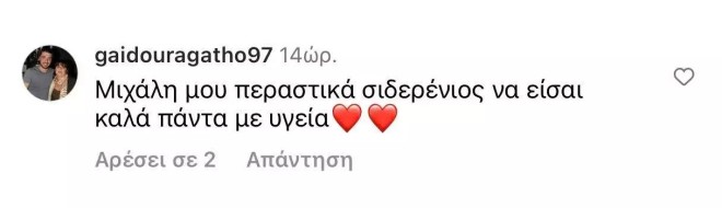 Η Αγγελική Μακρυπούλια, η οποία συνεχίζει να τρέφει αγάπη προς τον πρώην σύντροφο της κόρης της, έγραψε: «Μιχάλη μου περαστικά, σιδερένιος να είσαι καλά πάντα με υγεία».