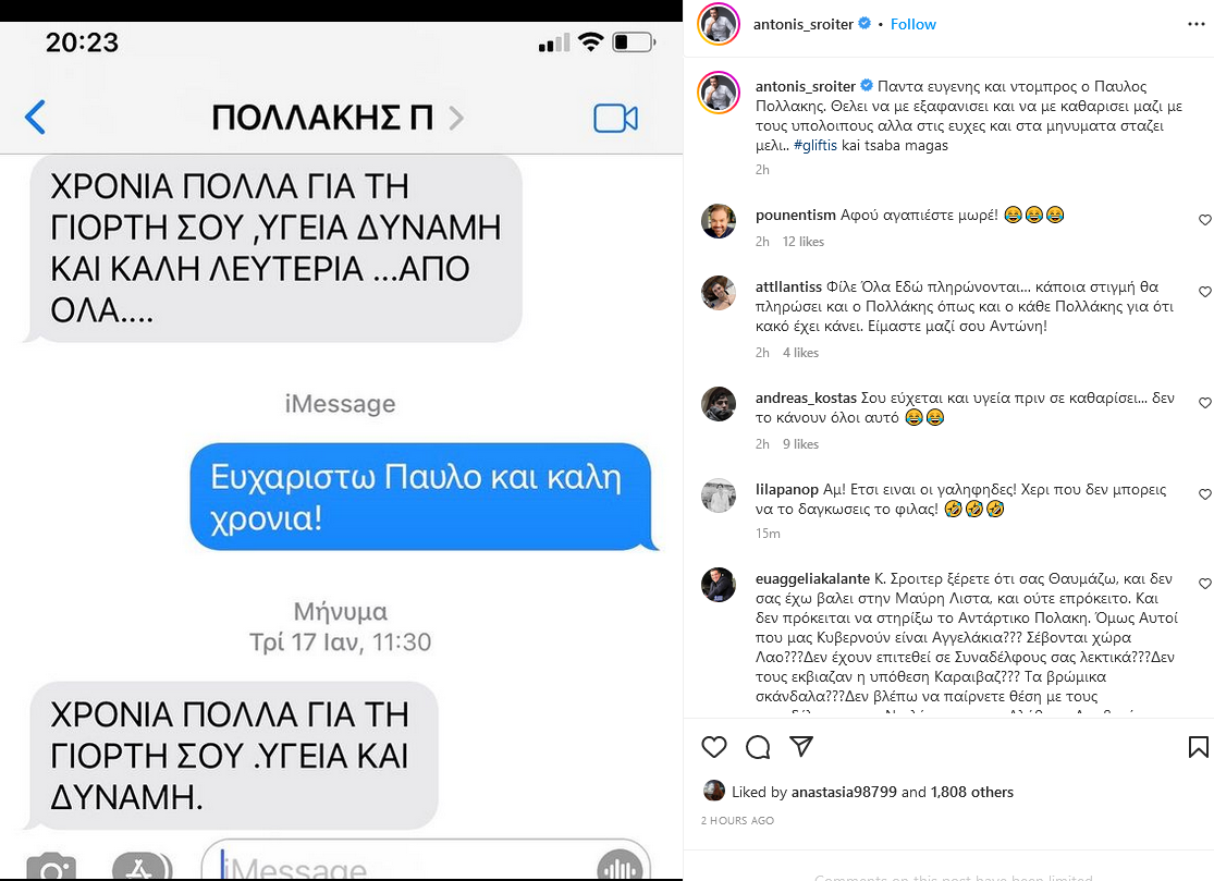 «Πάντα ευγενής και ντόμπρος ο Παύλος Πολάκης. Θέλει να με εξαφανίσει και να με καθαρίσει μαζί με τους υπόλοιπους αλλά στις ευχές και στα μηνύματα στάζει μέλι.. #gliftis kai tsaba magas» έγραψε στην ανάρτησή του στο Instagram ο Αντώνης Σρόιτερ δημοσιεύοντας φωτογραφία με μηνύματα.
