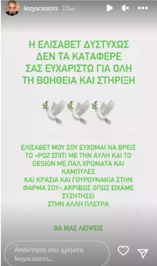 «Η Ελισάβετ δυστυχώς δεν τα κατάφερε. Σας ευχαριστώ για όλη τη βοήθεια και στήριξη. Ελισάβετ μου σου εύχομαι να βρεις το ροζ σπίτι με την αυλή και το ντιζάιν με παλ χρώματα και καμπύλες και κρασιά και γουρουνάκια στη φάρμα σου, ακριβώς όπως είχαμε συζητήσει στην άλλη πλευρά. Θα μας λείψεις».
