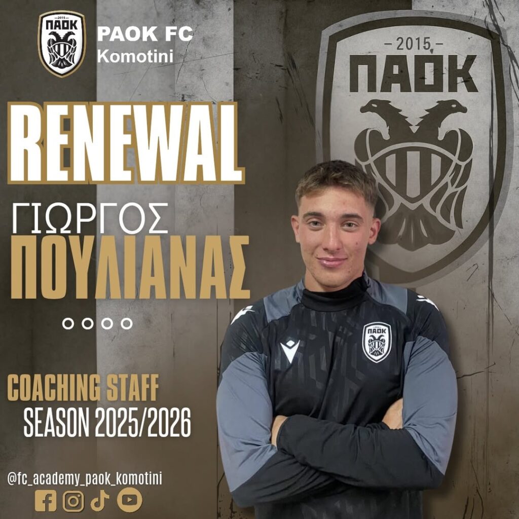 ⚫⚪⚽Η ακαδημία του ΠΑΟΚ Κομοτηνής είναι στην ευχάριστη θέση να ανακοινώσει την ανανέωση της συνεργασίας με τον Γιώργο Πουλιάνα, ο οποίος θα συνεχίσει για πέμπτη συνεχόμενη χρονιά να προσφέρει τις πολύτιμες υπηρεσίες του ως προπονητής του συλλόγου μας.