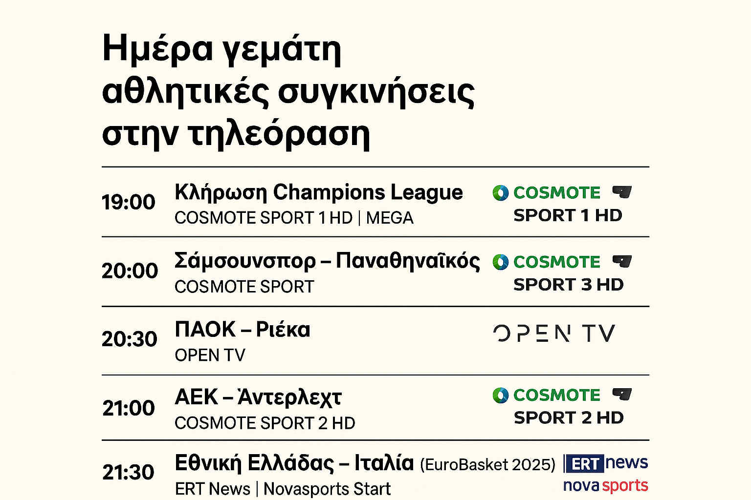 Η Εθνική ομάδα μπάσκετ στο EuroBasket Η μέρα κλείνει με το μπάσκετ. Η Εθνική Ελλάδας κάνει πρεμιέρα στο EuroBasket 2025 απέναντι στην Ιταλία στις 21:30. Ο αγώνας θα μεταδοθεί από το ERT News και το Novasports Start, με τους Έλληνες διεθνείς να θέλουν να ξεκινήσουν με το δεξί τη διοργάνωση. Εθνική Ελλάδας – Ιταλία (EuroBasket 2025) Ώρα: 21:30 Κανάλια: ERT News, Novasports Start