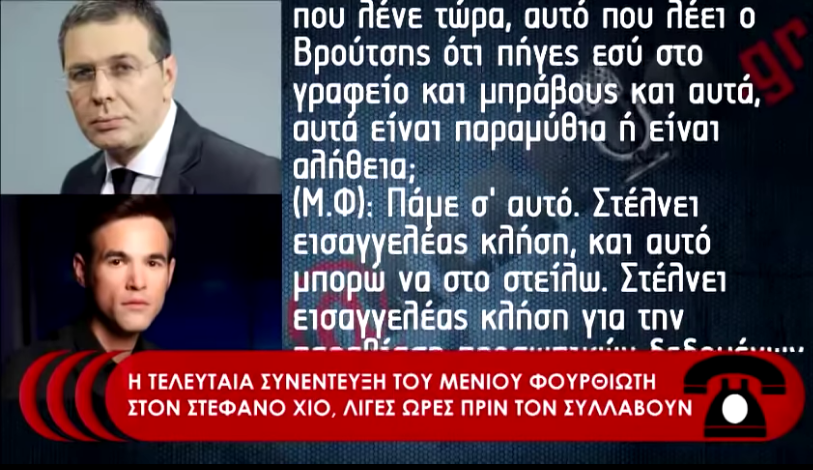 Την τελευταία του τηλεφωνική επικοινωνία με τον Μένιο Φουρθιώτη έδωσε στη δημοσιότητα ο Στέφανος Χίος, με όσα ακούστηκαν να ξεπερνούν κάθε φαντασία.