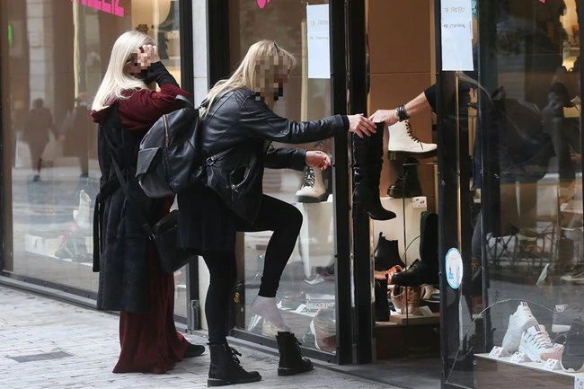 Στη φωτογραφία, η οποία έχει γίνει viral, βλέπουμε μία γυναίκα να… δοκιμάζει παπούτσια, στον πεζόδρομο έξω από το κατάστημα.