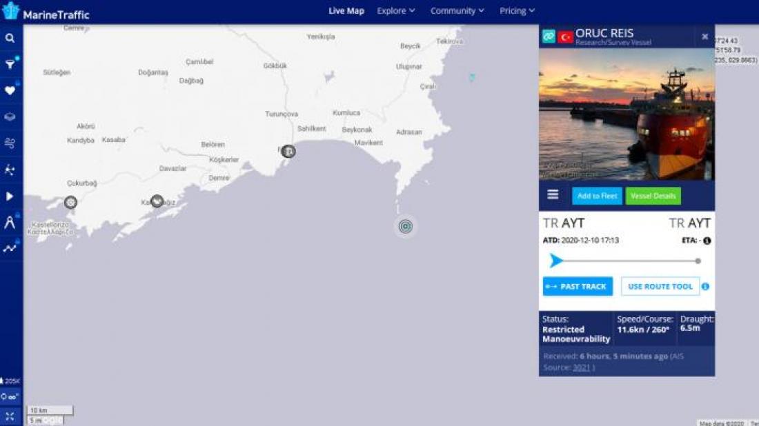 Απέπλευσε το βράδυ της Κυριακής από το λιμάνι της Αττάλειας το «Ορούτς Ρέις»και δείχνει να έχει ρότα προς την ευρύτερη περιοχή του Καστελόριζου. Πίσω του βρίσκονται τα συνοδευτικά πλοία «Ataman» και «Gengiz Ηan».