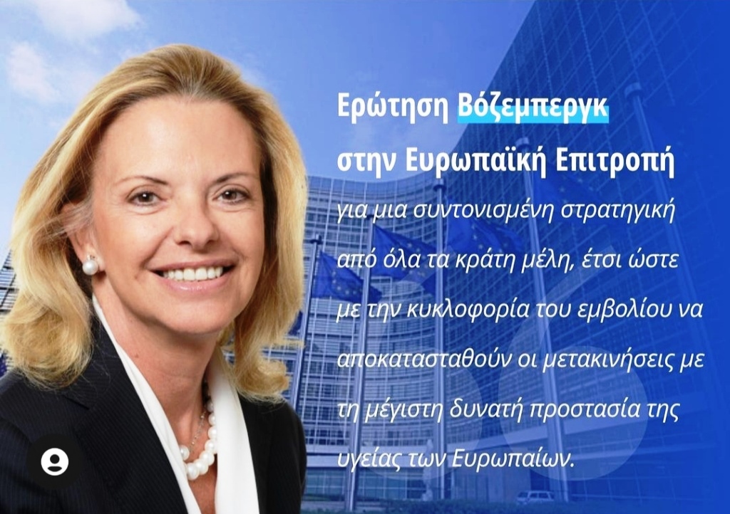 Στο πλαίσιο των ανακοινώσεων της Ευρωπαϊκής Επιτροπής για τη διάθεση του εμβολίου κατά της νόσου Covid-19 τους αμέσως επόμενους μήνες και με δεδομένη την κατακόρυφη πτώση των διασυνοριακών μετακινήσεων των Ευρωπαίων πολιτών λόγω της πανδημίας, η Ευρωβουλευτής της Νέας Δημοκρατίας και του Ε.Λ.Κ. και μέλος της Επιτροπής του Ευρωπαϊκού Κοινοβουλίου για τις Μεταφορές και τον Τουρισμό, κ. Ελίζα Βόζεμπεργκ-Βρυωνίδη, κατέθεσε ερώτηση στην Κομισιόν για την άμεση αποκατάσταση των μεταφορών στην Ε.Ε. με κοινή και συντονισμένη στρατηγική από όλα τα κράτη μέλη.