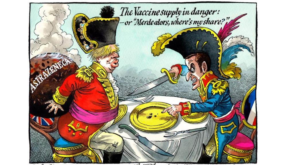 “Η προμήθεια εμβολίου σε κίνδυνο ή σκ… λοιπόν, πού είναι το δικό μου περίδιο” αναγράφεται στο σκίτσο που διακωμωδεί την κατάσταση με τα εμβόλια ανάμεσα στο Ηνωμένο Βασίλειο και την Γαλλία. / The Times