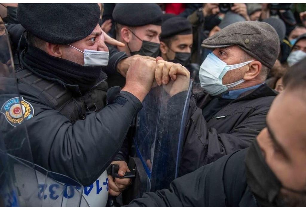 Turkish deputy Baris Atay (C) clashes with Turkish police on February 2, 2021 during a demonstration against Turkish President’s appointment of a party loyalist to head Istanbul’s exclusive Bogazici University at the start of the year.
