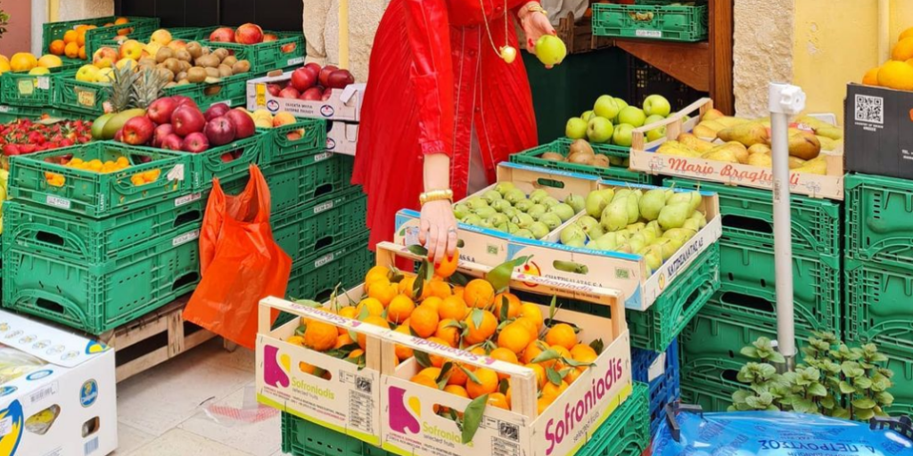Η γνωστή κυρία της σόουμπιζ ντυμένη γκράντε πήγε στο μανάβικο να κάνει τα ψώνια της.