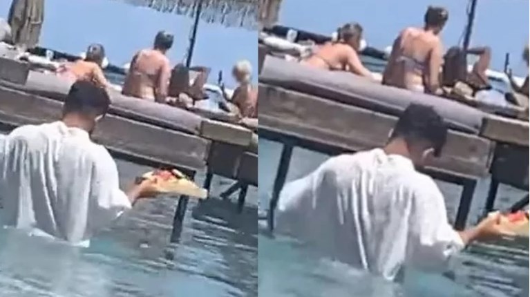 Βίντεο που κυκλοφόρησε δημόσια απεικονίζει τον υπάλληλο να σερβίρει κρατώντας τον δίσκο με τα φαγητά, μπαίνοντας στη θάλασσα με τα ρούχα και το νερό να φτάνει λίγο πιο κάτω από τον λαιμό του.