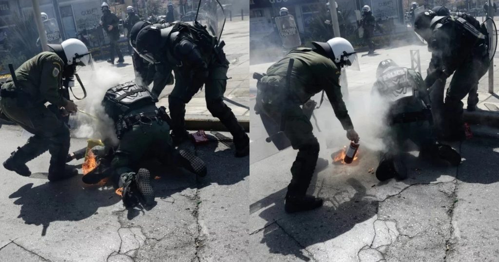 Κατά τη διάρκεια των των επεισοδίων που σημειώθηκαν στην Θεσσαλονίκη, αντιεξουσιαστές έκαναν ρίψη μολότοφ, κατά των αστυνομικών δυνάμεων. Ωστόσο, μία εξ αυτών έπεσε κατά λάθος σε… σύντροφό τους, διαδηλωτή. Ο άνδρας «λαμπάδιασε» ενώ οι άνδρες των ΜΑΤ έσπευσαν να σβήσουν την φωτιά.