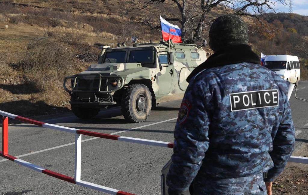 Russian peacekeeper vehicles drive through an ethnic Armenian checkpoint near Getovan in the separatist region of Nagorno-Karabakh several kilometers before the new border with Kalbajar district turned over to Azerbaijan, Wednesday, Nov. 25, 2020. The Azerbaijani army has entered the Kalbajar region, one more territory ceded by Armenian forces in a truce that ended deadly fighting over the separatist territory of Nagorno-Karabakh, Azerbaijan's Defense Ministry said Wednesday. The cease-fire, brokered by Russia two weeks ago, stipulated that Armenia hand over control to Azerbaijan of some areas its holds outside Nagorno-Karabakh's borders. (AP Photo/Sergei Grits)